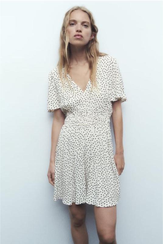 Струмуюча сукня з V-подібним вирізом, короткими рукавами та резинкою на поясі. Розмір в наявності XS , буде на і на S , трохи велекомірить Заміри Плечі 35 см В грудях 47-48 см Талія 31 ( на резинці ) тягнеться до 47 см Довжина 85 см З офіційного сайту З усіма бірками Без повернення Без торгу По бірці 49.90$ Оплата 100% на карту Склад : 100% віскоза