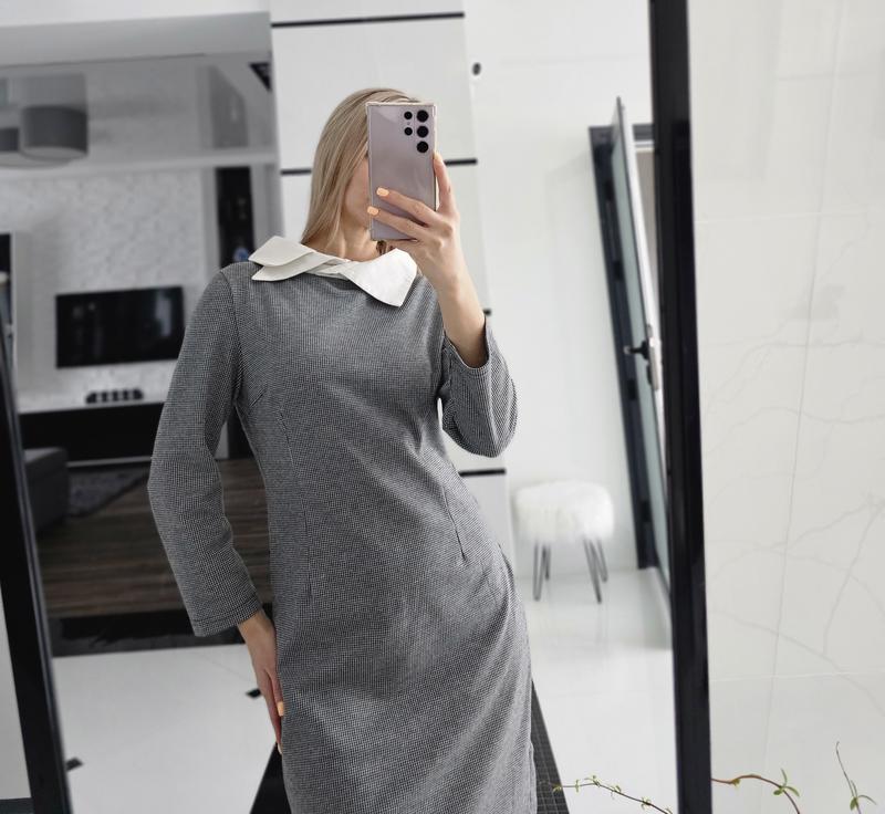 сукня вище коліна, з відкладним подвійним коміром з атласу. по спинці на довгій металевій блискавці. на підкладці. на обєм стегон до 100см. зріст моделі 168 см
