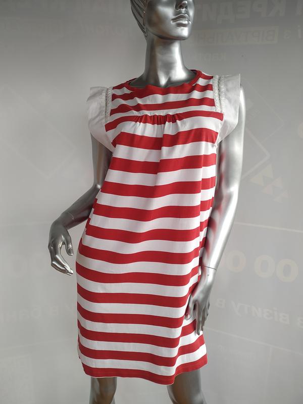 Гарне плаття вільного крою в смужку. Внутрішні біркі зрізала.Заміри плечі 31 см,ПОГ 50 тягнеться до 54 см,ПОТ 55 тягнеться до 61 см,ПОБ 55 тягнеться до 61 см,довжина 86.