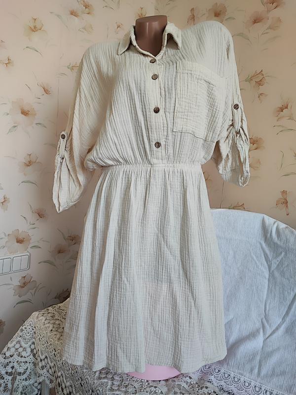 Брендовое платье- мини цвета эйвори в ретро стиле. Спереди на пуговицах до линии талии, небольшой отложной воротничок. В поясе на резинке, 36 см., тянется до 52 см. Рукав кимоно до локтя, от выреза горловины 52/40 см., укорачивается на пуговицу. Нагрудный большой карман. Ткань лёгкая, качественная ,рельефная жатка. Состояние идеальное.