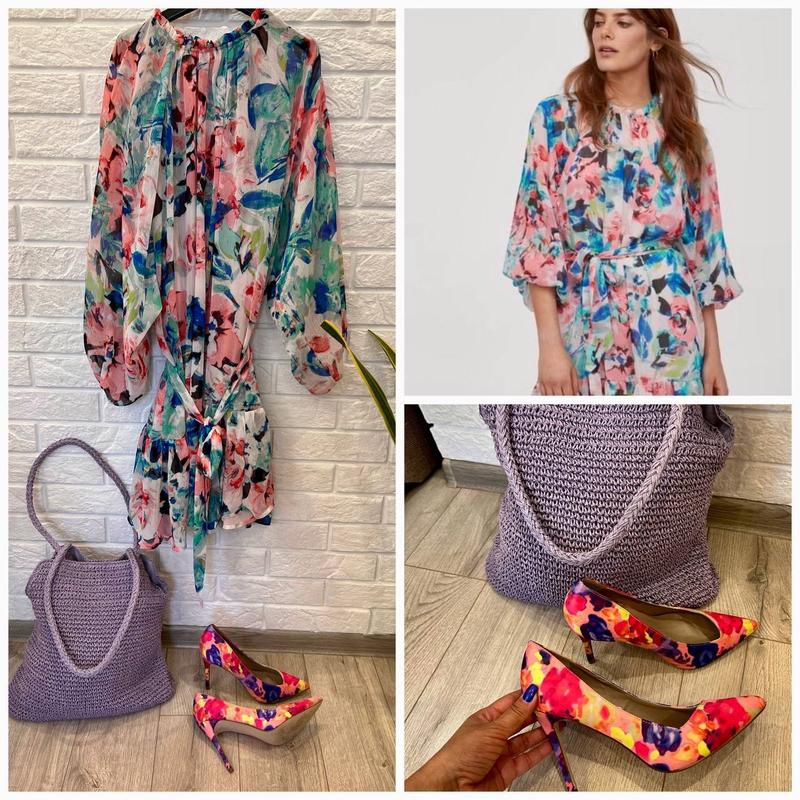 Короткое широкое платье из воздушного жатого шифона с низким воротником-оборкой от H&M Не носилось, размер М Широкие рукава реглан длиной три четверти с узкой резинкой снизу. Разрез сзади с потайной пуговицей у горловины Длина 100 см, ПОГ 50 см, на подкладке, цена 750 грн! Текстильные лодочки Dorothy Perkins, размер 38 ( на узкую/среднюю ногу), выходили раз в помещении, цена 460 грн! Сумка авоська цвета лаванды, новая Цена 399 грн!