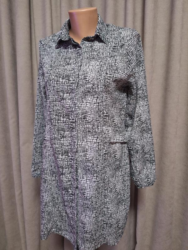Платье-рубашка или можно носить как туника,Все зависит от роста и предпочтения.Орентируйтесь по замерам.Отлично смотрится с белыми брюками.Полиэстер.Ткань приятная.Размер 8.Одетo на манекен S.
