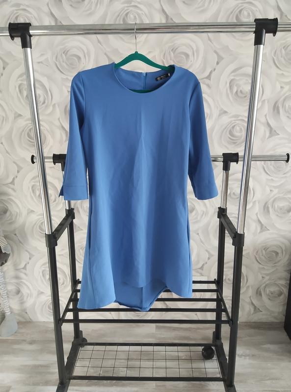 Сукня красивого блідо- блакитного кольору має асиметричний низ, рукав три чверті з невеликим розрізом та два кармани, що додає виробу практичності. Відклеівся підворот по низу, потрібно або підклеіти, або підшити