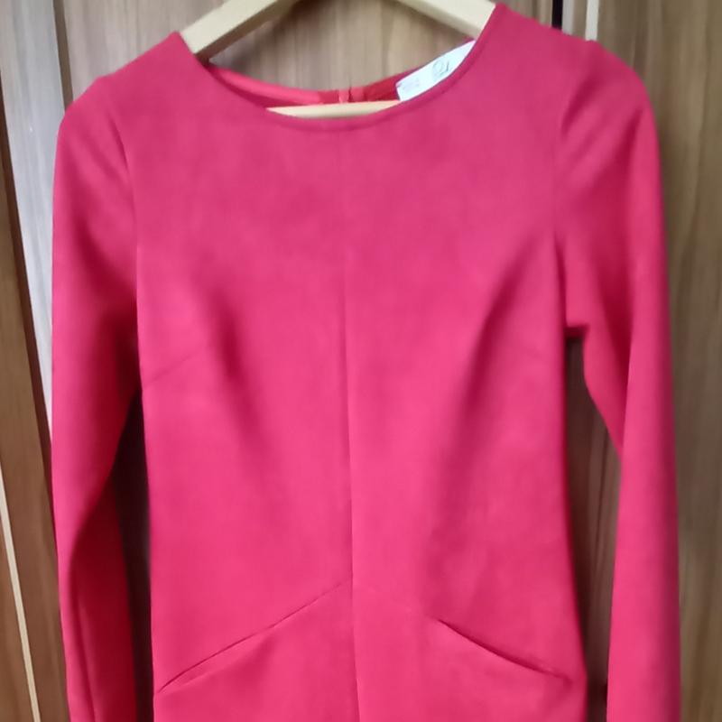 Тканина під замш, легко ворсиста. Колір не такий яскравий,як на фото, приглушенокораловий.Півоб'єм в грудях-80 см, довжина по спинці- 83.