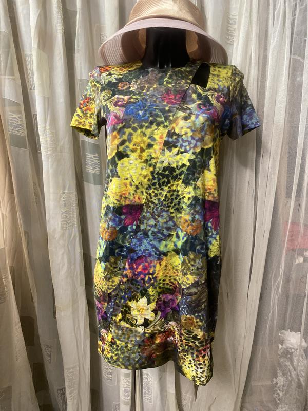 Яркое трикотажное платье. Состояние новой вещи. Состав:котон/вискоза/эластан(48/47/5). Размер по набору-36. Замеры: длина-85 см, ПОГ-46 см, ПОБ-46 см.
