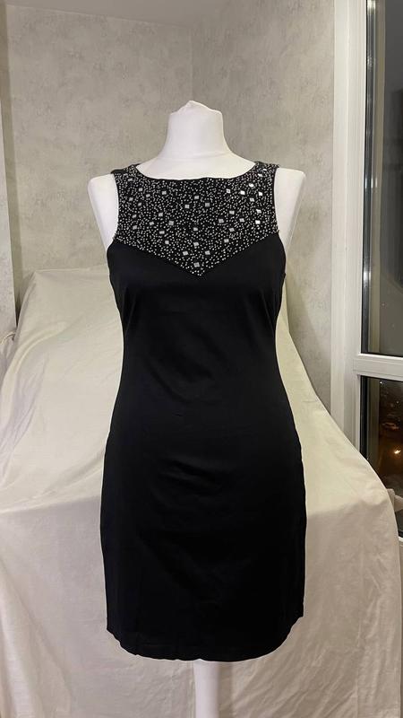 Красивое платье по фигуре черного цвета известного бренда ZARA. Сзади застегивается на длинную молнию, впереди красивое ожерелье из бусинок, ткань плотная и эластичная, есть тонкая подкладка. Есть небольшой нюанс - надо пришить пару бусинок, или нет, потому что я его носила так и ничего никто э увидел (нюанс находится на фото в конце). Обхват груди - до 92 см Обхват талии - до 82 см Длина по спинке -87 см Размер: L (но немного маломерит, лучше сядет на размер М)