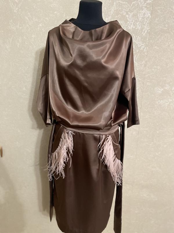 Платье шоколадного цвета, декорировано страусиными перьями на карманах, мягкая приятная ткань, красиво ложится по фигуре.