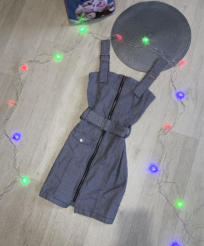 Короткий узкий сарафан с молнией спереди и регулируемыми лямками с металлическими пряжками. Съемный и регулируемый пояс на талии, маленький передний карман с клапаном на кнопке.