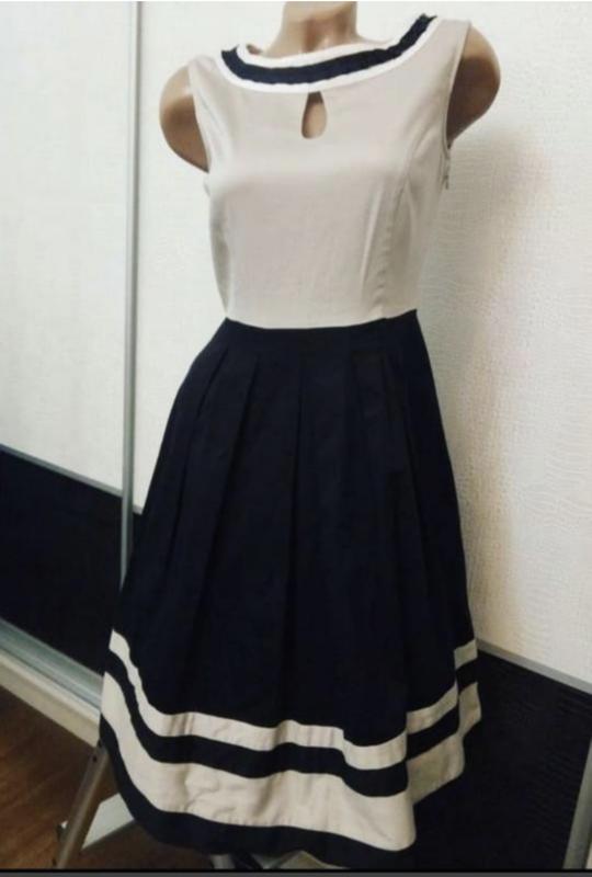 Прекрасное французское летнее платье Votre Mode на все случаи жизни 👍 Отличное сочетание черного и бежевого цветов. р.S На боку молния. Без подкладки. Нижняя часть клеш. Длина по спинке 95-96см ширина между подмышками 43см, тянется Пот 38см, Длина от плеча до черной юбки 37см