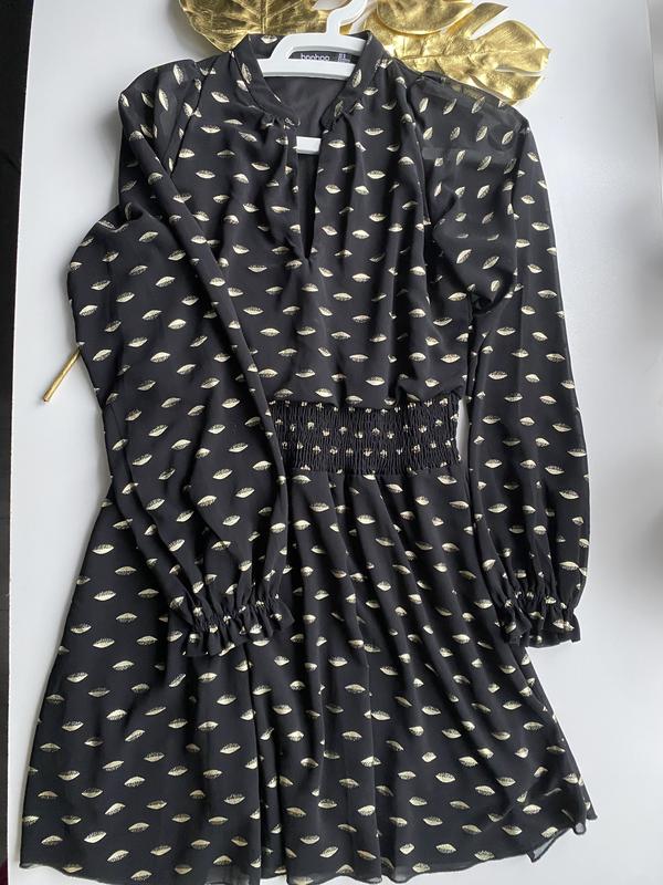 Платье очень красивое с объемным рукавом и золотым принтом Размер XS/S, пог-44, пот-34,45( на резинке), длина-86, рукав-64