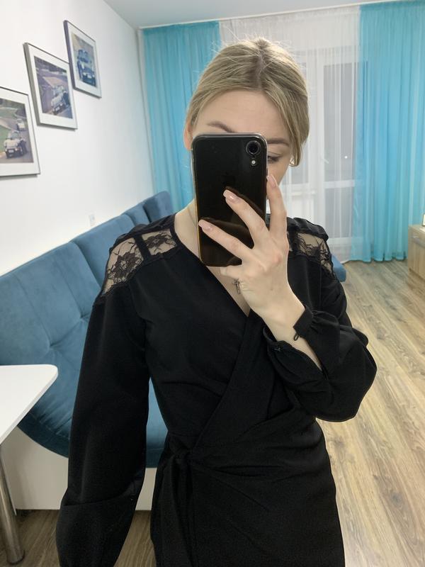 Однотонное платье на запах черного цвета (б/у) в очень хорошем состоянии. Модель длины мини с V-образным вырезом и длинными объемными рукавами. Имеет ровный обработанный низ. Завязывается на скрытый пояс изнутри и широким поясом на внешней стороне. Рост на фото- 156см. Модель может быть на размер S-M