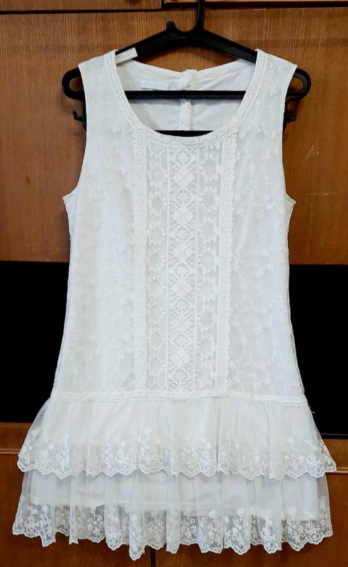 520 Короткое летнее платье из кружева. С чехлом. Молочного цвета. Слегка тянется. Размер 10-12. На рост до 168 см, талию до 75 см, бедра до 96 см, объем груди до 102 см. Ширина плечей 36 см Ширина груди 49 см Ширина бедер 49 см Длина платья 88 см, длина чехла 82 см.
