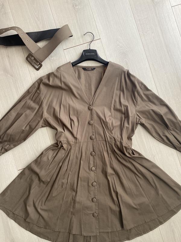 Платье оливкового цвета, камера не передает. Задди чуть длиннее, чем спереди, есть ремешок на талию, рукав укороченный. Рукав 40 см Длина 89-83 см ПОГ 50 ПОТ 43( талия на резинке) Имеет карманы