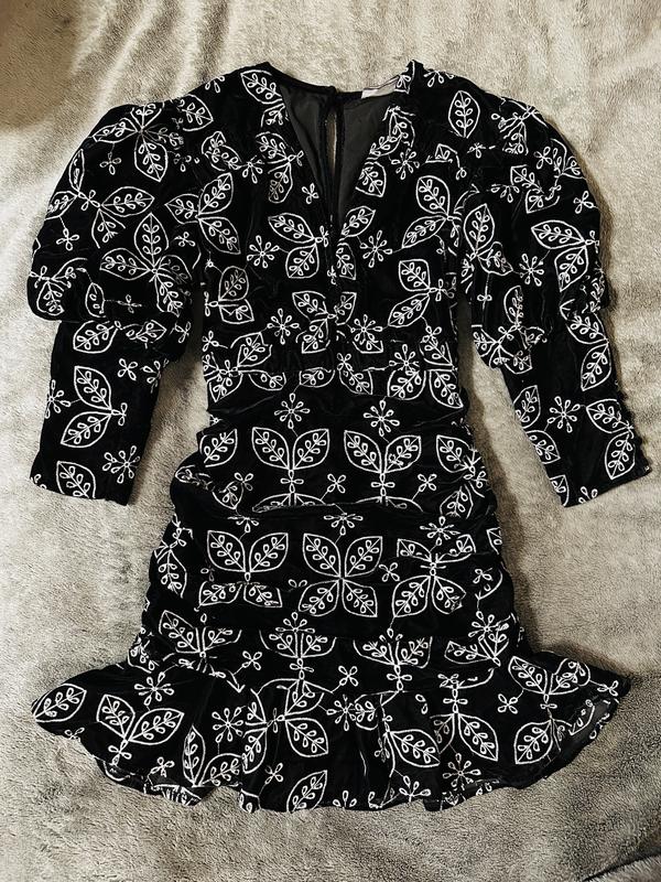 Дуже гарне фірмове плаття ASOS, розмір 10, С-М. Одягалось тільки один раз на свято, стан нової речі. Чорне, оксамитове із перфорацією на підкладці, рукава - ліхтарики застібаються на ряд із ґудзиків, глибокий виріз попереду та виріз на спиці (фото 5-6), застібається позаду на змійку. Виглядає дуже вишукано. Коштувало 45$, продаю набагато дешевше.