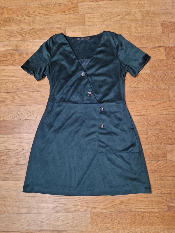 Мини-платье темно-зеленого цвета. оригинальный фасон. с кармашком (вмещает телефон). со стороны есть молния. материал будто как замш. есть подкладка. длина платья от середины плеча - 80 см/ по плечам - 36 см/ талия 39 см/ бедра - 52 см.