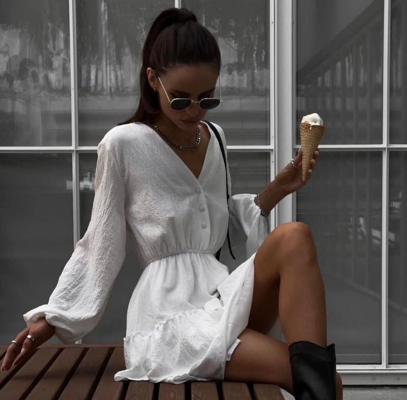 Наше бомбезное платье на весну и лето. Легкое женственное. Можно носить весной под косуху, или возможно, как летнее пляжное платье. Качественная и приятная ткань - муслин (не светится). Верх застегивается на кнопки, талия на резинке, бедра свободны. Тканина: муслін. Цвет: белый. Размеры: 42-44, 46-48.
