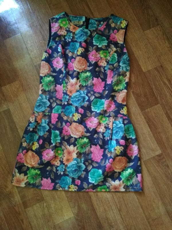 Очень красивое платье тёмно-синего цвета в цветочный принт. Ткань лёгкий неопрен, хорошо держит форму. Размер с-хс. Новое, не одетое, но без бирок. Мне к сожалению, маленькое. Можно носить как тунику. Длина-77 см., Пог-42 см., Пот- 40 см.