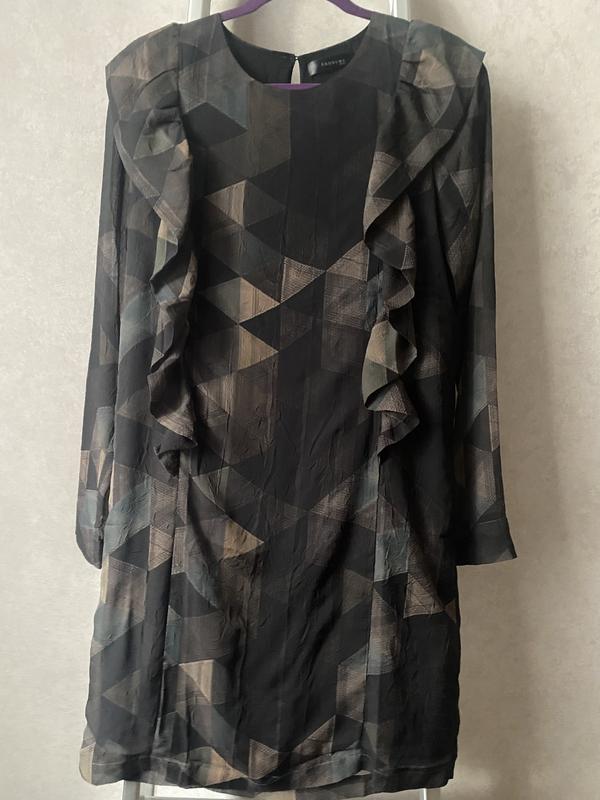 Шикарное платье с рукавом на подкладке с вертикальными рюшами впереди и сзади. Ткань шёлковой слегка жатой структуры, мягкое, не мнётся. Длина 95 А/ об 46, бедра 48 Плечи 38 Рукав 64