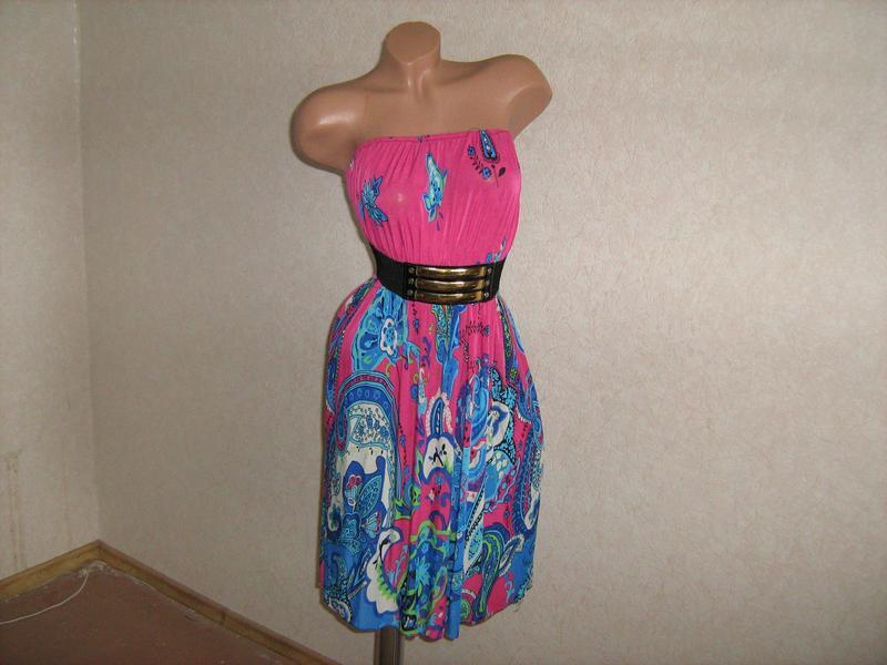 Сарафан в отличном состоянии. Размер 44-48. Длина от подмышки 83 см. По верху платья резиночка, ее ширина 30 см + тянется до 55 см. На талии резинка, ее ширина 28 см + тянется до 60 см.