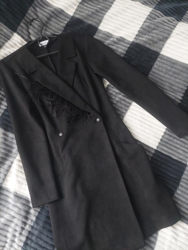 Черное платье из очень приятной ткани, похожей на замш, перышко отстегивается, платье одевается на две заклепки, можно также носить как кардиган, два кармана рабочие, без дефектов