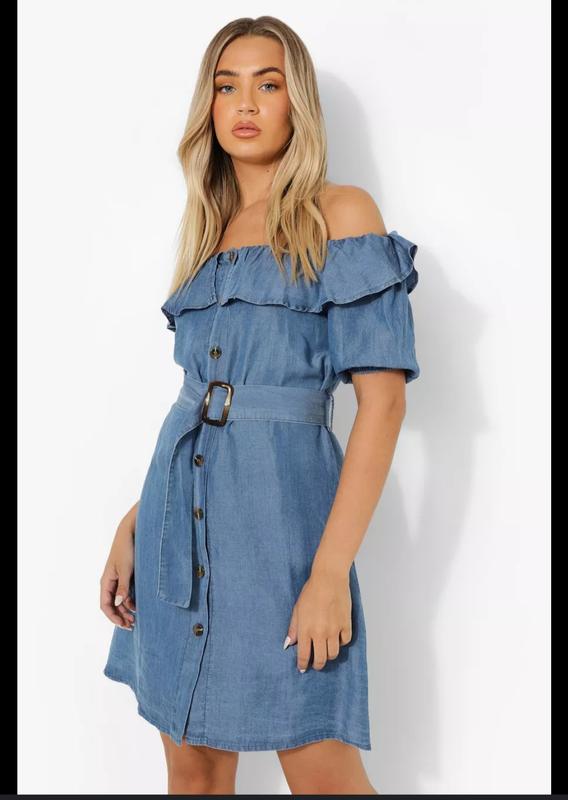 платьице, лёгкий джинс (лиоцел), пышный рукавчик, сверху волан, застёжка пуговки, под поясочек