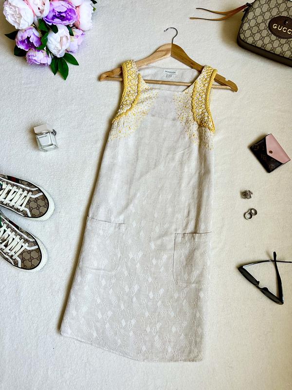 Летнее платье monsoon прямого кроя с бисером и вышивкой, летнее платье лён, платье с вышив...