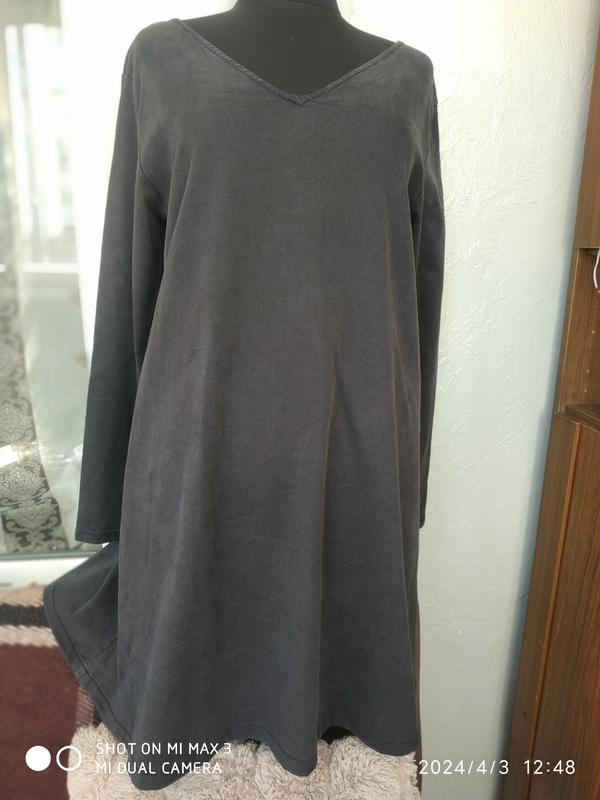 Чудесное платьице,красивого,свободного кроя.Красивый вырез и спереди и сзади.Классно смотрится. Цвет мокрого асфальта.Ткань смотрится как джинс. Состав отличный из 5 компонентов.Пог-53,5см пот-59. поб-67,5см .длина-88,5см.