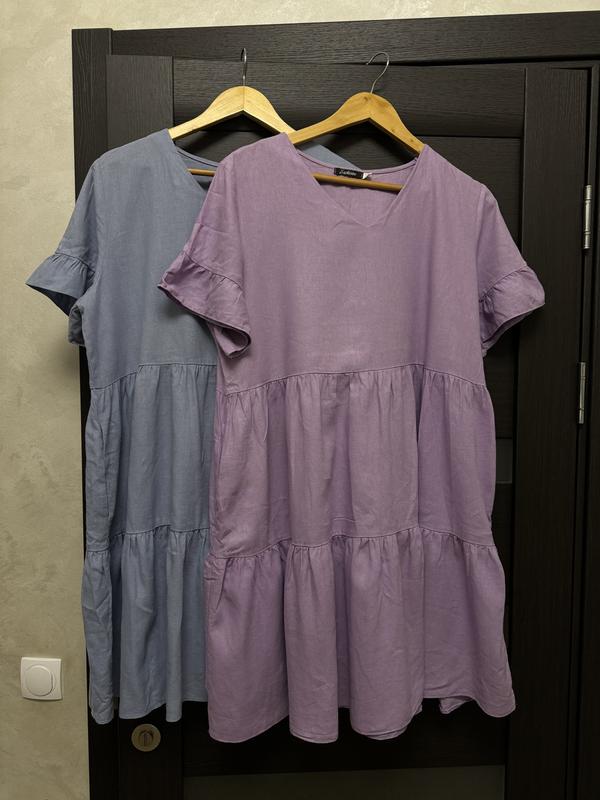 Чудова сукня лен вільного крою . Дуже якісна тканина , мʼяка і не парить . Носила їх коли була вагітна . Стільки раз пралися а вигляд все одно мають як нові . Е кармани ОГ 116 Плечі 39,5 Довжина 95 Е в обох кольорах