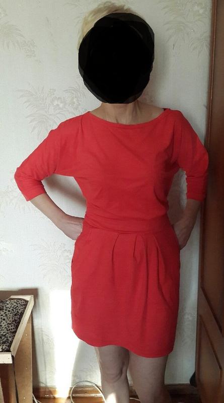 Платье красного цвета. Тянется, красивое, простое, ткань как будто бархатная, с пояском. Пойдет на С и М
