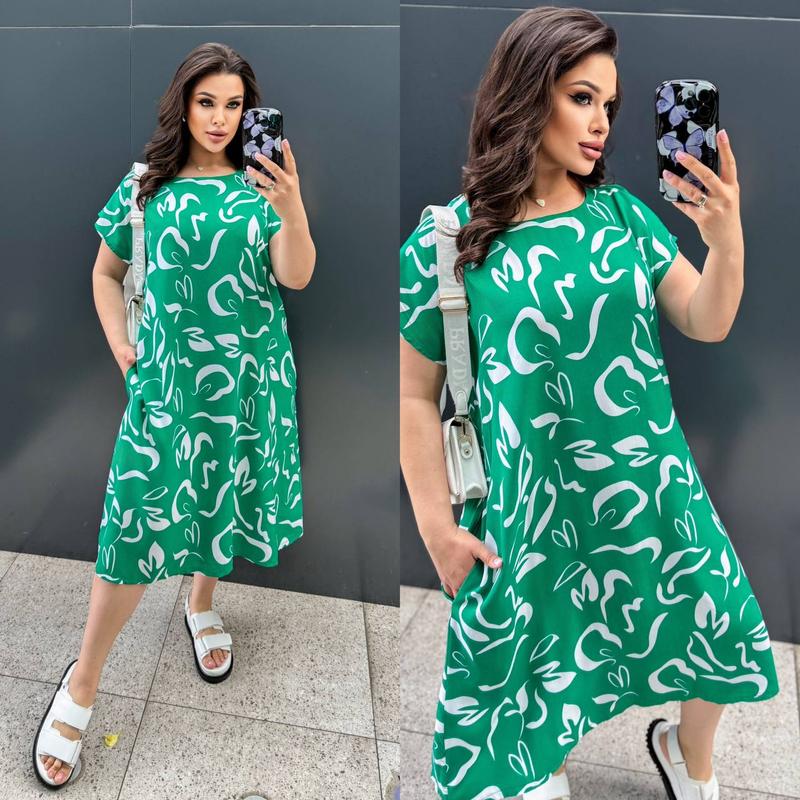 Плаття Тканини штапель Колір чорний, синій, зелений, бежевий Розмір 48-50,52-54,56-58 Сукня вільного крою, короткий рукав, з кишенями. Ціна : 570 грн