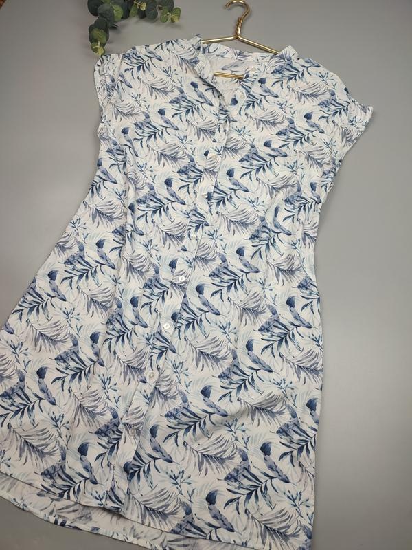 Легкое летнее платье-рубашка с принтом бренда Chicoree. На пуговицах, цвет белый с сине-серым принтом. Имеет стяжки для пояса, поэтому можно дополнить образ любым пояском по вкусу. Стан идеален. Размер подойдет на разные обхваты, может носиться как оверсайз или приталено. Замеры: Полуобхват груди - 50 см Полуобхват низа - 58 см Длина - 90