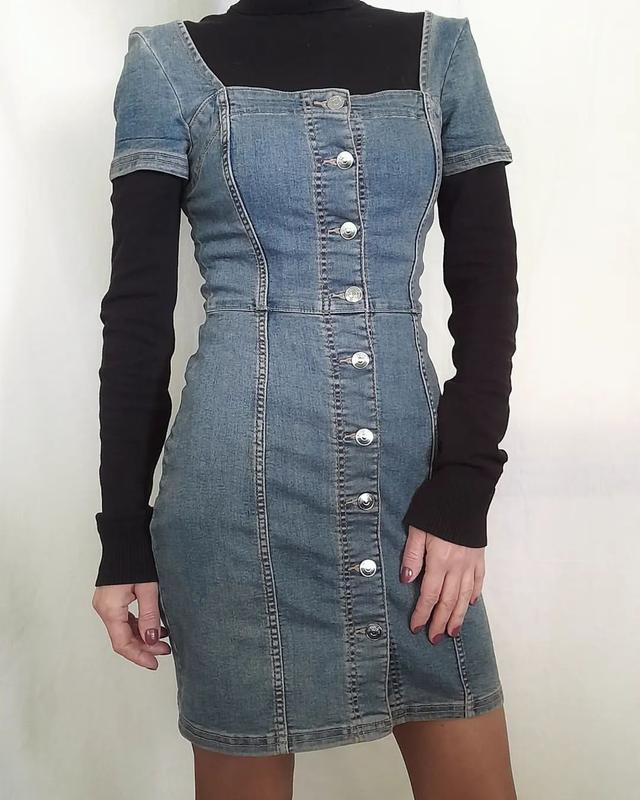 Джинсовое стрейчевое платье, застегивающееся на пуговицах впереди. В идеальном состоянии, с биркой, без дефектов Размер: S (165/88а) Длина – 80 Грудь - 35 Бедра – 40 Талия – 31 Рукав - 15