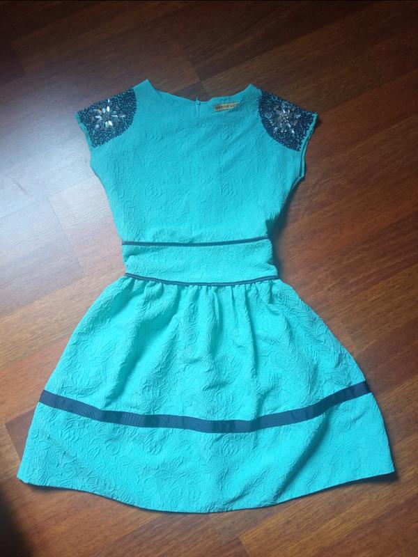 Сукня на потайному замку, прикрашена стразами. Бирюзовый цвет. Стан идеален, одевалась один раз.