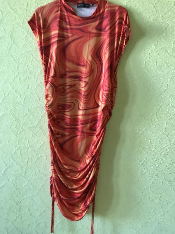 Платье со стильными стяжками по длине Прикольный принт Стяжки не регулируют длину, но зачет них садится по фигуре в виде мини платья