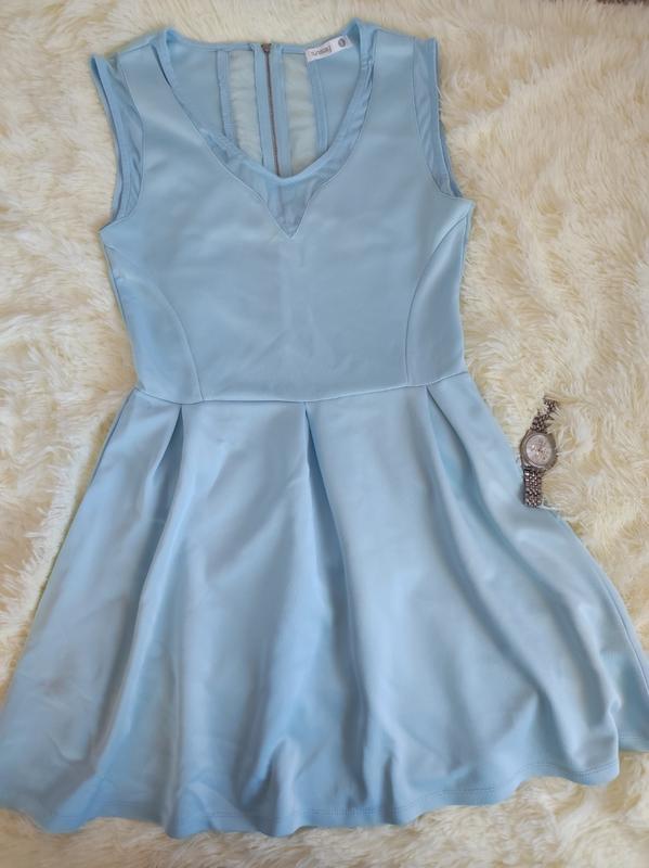 Платье голубого цвета, есть определенные недостатки (на фото)