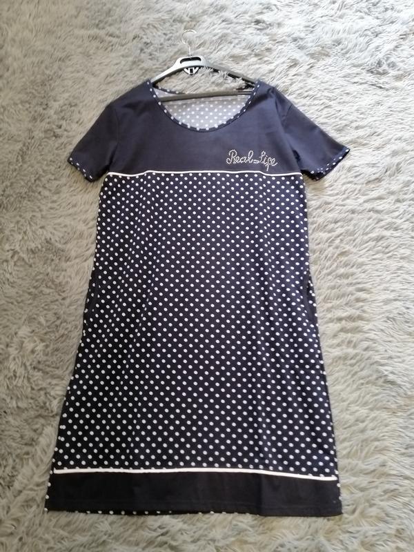 темно синє плаття футболка з бічними кишенями в горох прикрашена написом зі страз розмір на бирці XXXL етикеток складам тканини немає виміри плечі від шва до шва 48 см напівобхват грудей 53 см тягнеться на 67 см напівобхват стегон 55 см тягнеться на 72 см довжина сукні 99 см