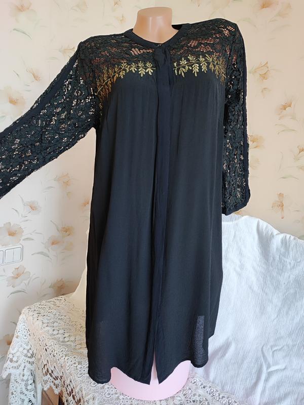 Стильное платье-рубашка чёрного цвета с потайной застёжкой на пуговицы. В плечах 40 см. Рукав 3/4, длина от плеча 46 см. Плотное кружево на рукавах, по спинке и спереди украшено вышивкой гладью золотистыми нитками. Длина спереди 92 см. По бокам небольшие разрезы 8 см. Состояние идеальное. Дефектов нет.