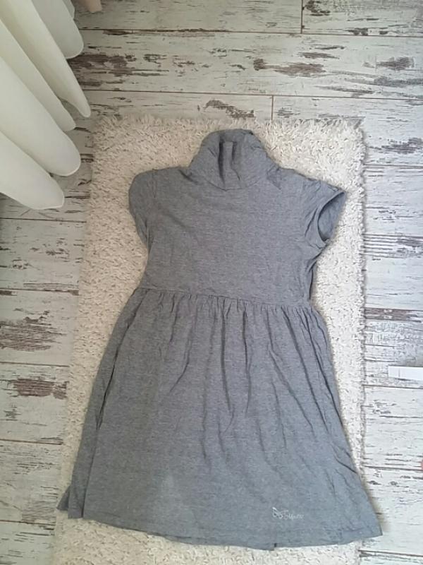 Симпатичне сіре трикотажне платтячко з короткими рукавами і коміром-стійкою. Розмір вказаний 40, але швидше на 38, хоча тканина добре тягнеться