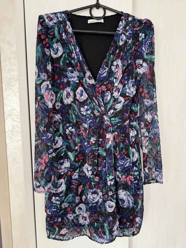 Яркое, красивое платье в цветочный принт, из приятного к телу шифона, есть подкладка. Платье в идеальном состоянии. Размер L, но маломерит, подойдет на S-M.