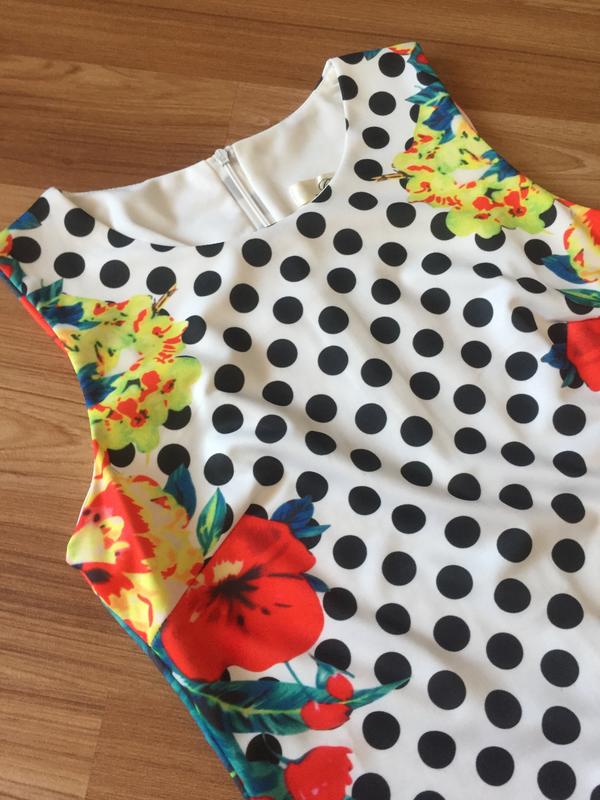 Шикарно поєднались в цьому платті горошок і квіти. Одягала тільки один раз, плаття стилізоване під українську вишиванку за рахунок квітів по боках