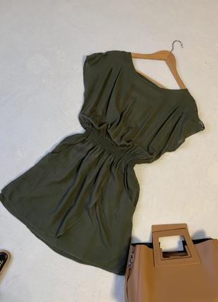Шикарна сукня Colin’s. Оригінальна спинка. В талії на м'якій резинці. Ілюзія спідниці на запах. На підкладі. Колір -оливка. 100%віскоза, підклад-100%поліестер. На бірці розмір М, підійде на S. ПОГ - вільно (до 55см) ПОТ - 26 см (тягнеться до 40 см) ПОБ- вільно (до 55см) Довжина 85 см.