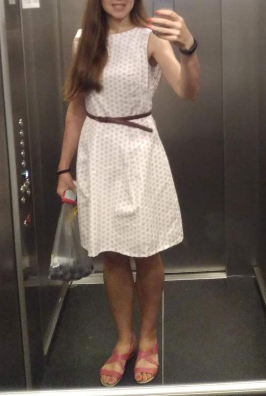 Легкое летнее платье. Приталенная, кремовая с сиреневыми цветами. С подкладкой юбки (не просвечивает белье). Длина доколина. Размер М. Молния сбоку. Есть два кармашка в боковых швах. Можно носить с пояском. Материал - хлопок Состояние - идеальный.