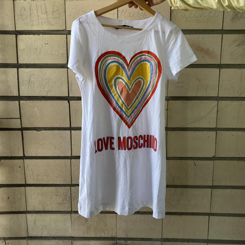 сукня футболка Love Moschino. Розмір 12( С, М,Л). Великий логотип попереду. Луже легка, Чудова підійде під Вашу фігуру. Освіжити в пранні. Встигніть придбати. Плечі 41,5 Пахви 47 Довжина по спині 81