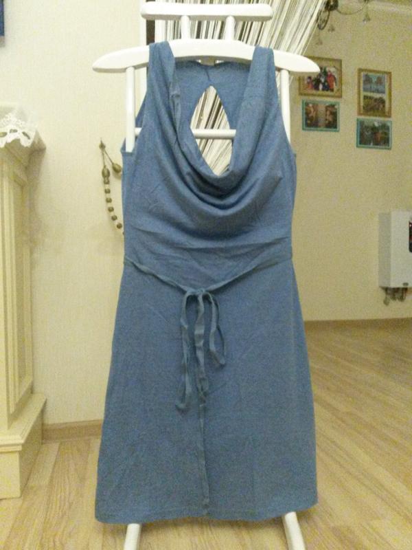 Тоненькое трикотажное летнее платье оригинального кроя, спереди драпировка с красивым вырезом на груди, сзади открытая спинка