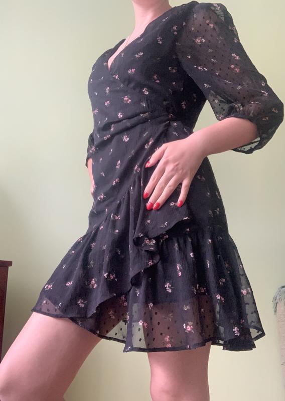 Очень красивое невесомое платье на запах черного цвета в цветочный принт. Бренд недешевый. Как новая, одевалась раз. Запах регулируется поясом, поэтому платье красиво ложится. Есть подкладка, не просвечивает. Размер указанный м. На фото одето на рост 165 см и размер с. Подробные замеры задайте вопросы. Цена без торга. Отправлю новой и укр по почте.