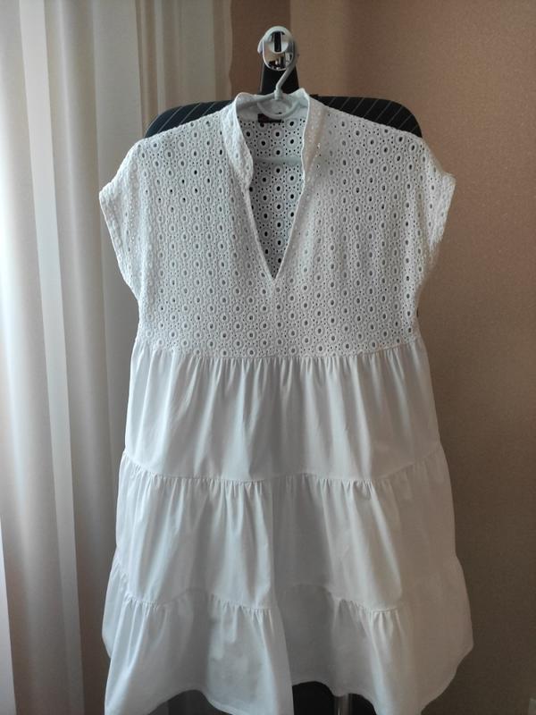 Платье имеет легкий материал в нежном белом оттенке - это мечта для невероятно солнечного и жаркого лета. Белое ярусное платье,верхнее часть которого выполнено из прошвы. Платье выполнено из полностью натурального материала. Длина изделия: 85 см. Плечі: 40см Пог: 42 см