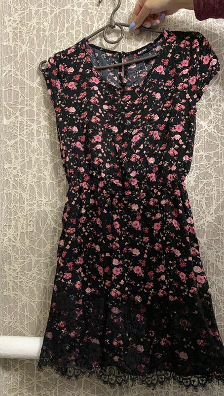 Довжина рукава: Короткий рукав, знизу Мереживо. Без застібки. Є пуговичка ззаду. Круглий виріз. Матеріал: Віскоза. Фактура: Гладка. Довжина виробу: Міні 75 см. Розмір S. Квітковий візерунок. Одягнута 1 раз.