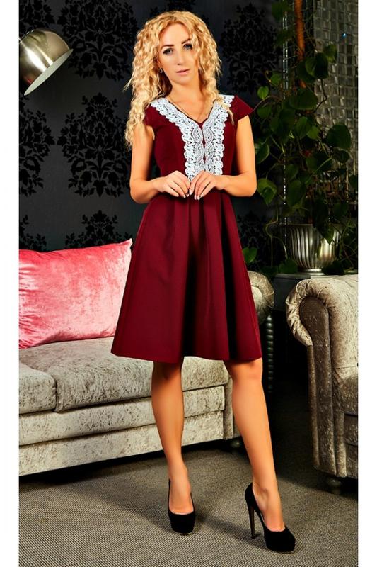 Плаття, бордового кольору.На грудях оздоблене мереживом. На спинці є прихований замочок. Розмір 48. Тканина костюмка.