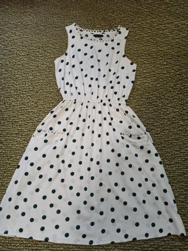 легкое платье с кишняками в принт горох талия на резинке не светится ткань приятная к телу на размер s-m отличное качество состояния идеально