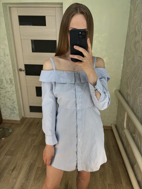 Сукня рубашка у смужку New look Цвет - голубой, белый Размер 8 Рост 155- 160 см Пог 44 см Рукав с подмышками 36 см Пот 33,5 см Пос 50 см Длина по спинке 66 см с переда 68 смне учитывая брители Стан - идеальный Дефектов нет Одетая на рост 165 см (для меня короткая )